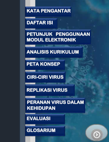 KATA PENGANTAR DAFTAR ISI PETUNJUK PENGGUNAAN MODUL ELEKTRONIK ANALISIS KURIKULUM PETA KONSEP CIRI-CIRI VIRUS REPLIKASI VIRUS PERANAN VIRUS DALAM KEHIDUPAN EVALUASI GLOSARIUM