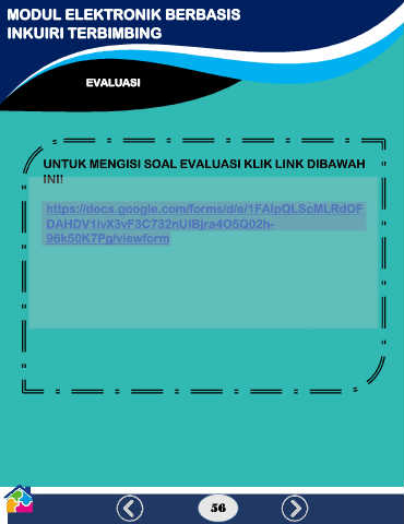 MODUL ELEKTRONIK BERBASIS INKUIRI TERBIMBING EVALUASI UNTUK MENGISI SOAL EVALUASI KLIK LINK DIBAWAH INI! https://docs.google.com/forms/d/e/1FAIpQLScMLRdOF DAHDV1ivX3vF3C732nUIBjra4O5Q02h- 96k50K7Pg/viewform 56