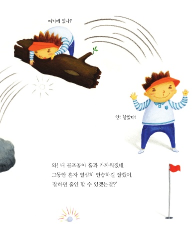 여기에 있나? 앗! 찾았다! 와! 내 골프공이 홀과 가까워졌네. 그동안 혼자 열심히 연습하길 잘했어. '잘하면 홀인 할 수 있겠는걸?'
