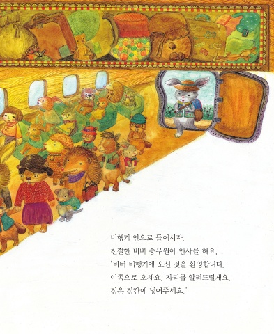 비행기 안으로 들어서자, 친절한 비버 승무원이 인사를 해요. "비버 비행기에 오신 것을 환영합니다. 이쪽으로 오세요. 자리를 알려드릴게요. 짐은 짐칸에 넣어주세요."