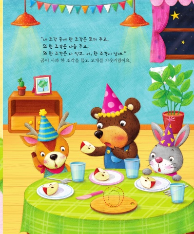 “네 조각 중에 한 조각은 토끼 주고, 또 한 조각은 사슴 주고, 또 한 조각은 나 먹고. 어, 한 조각이 남네.” 곰이 사과 한 조각을 들고 고개를 갸웃거렸어요.
