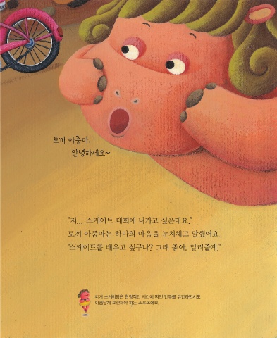 토끼 아줌마, 안녕하세요~ "저... 스케이트 대회에 나가고 싶은데요." 토끼 아줌마는 하마의 마음을 눈치채고 말했어요. "스케이트를 배우고 싶구나? 그래 좋아, 알려줄게." 피겨 스케이팅은 한정적인 시간에 짜인 안무를 유연하면서도 아름답게 표현해야 하는 스포츠에요.