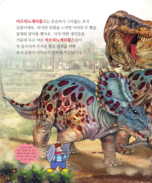 아르히노케라톱스는 온순하기 그지없는 초식 공룡이에요. 하지만 위험을 느끼면 이마의 두 뿔을 앞세워 방어를 했어요. 아직 약한 새끼들을 가운데 두고 어른 아르히노케라톱스들이 빙 둘러서서 무서운 뿔로 위협을 하며 육식 공룡이 다가오지 못하게 막았답니다. 목장식과 뿔이 마치 방패와 창 같아. 방패로 막으면서 창으로 찌르려고 준비하고 있는 것 같지 않아? 12 12 KG2_��_12�.indd 12 11. 12. 9. �� 12:31