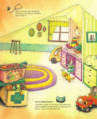 청진기는 우리 몸의 심박 수를 점검하여 어디에 이상이 있는지를 알 수 있게 해주는 중요한 도구랍니다. 청진기의 원리를 알아볼까요? 1초에 얼마나 진동을 하는가에 따라서 소리가 달라지는데, 청진기의 떨림판은 진동수를 받아들여 그 진동수만큼 소리 를 내요. 그리고 우리의 귀에 전달해 줘요.