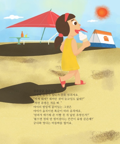 살금살금 슬금슬금 그런데 갑자기 엉디가 우뚝 멈춰서요. “저게 뭐지? 새까만 것이 눈코입도 없네?” “저런 유령은 처음 봐.” 아이의 발밑에 붙어있는 그것은 아이가 움직이면 똑같이 따라 움직여요. ‘엄마가 얘기해 준 이빨 천 개 달린 유령인가?’ ‘붙으면 절대 안 떨어진다는 끈끈이 유령 같은데?’ 궁디와 엉디는 바들바들 떨어요.