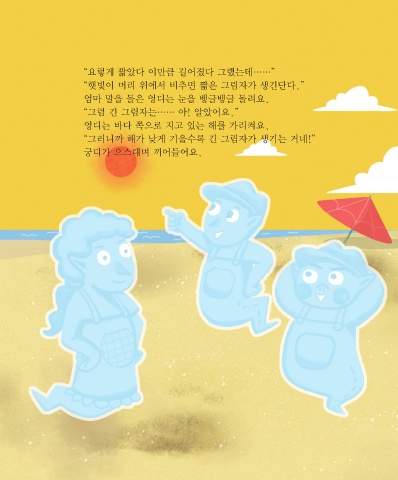 “요렇게 짧았다 이만큼 길어졌다 그랬는데……” “햇빛이 머리 위에서 비추면 짧은 그림자가 생긴단다.” 엄마 말을 들은 엉디는 눈을 뱅글뱅글 돌려요. “그럼 긴 그림자는…… 아! 알았어요.” 엉디는 바다 쪽으로 지고 있는 해를 가리켜요. “그러니까 해가 낮게 기울수록 긴 그림자가 생기는 거네!” 궁디가 으스대며 끼어들어요.