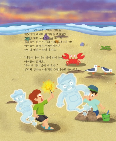 오늘도 꼬마유령 궁디와 엉디는 바닷가에 내려와 아이들을 괴롭혀요. 아이가 쌓은 모래성을 궁디가 툭! 불꽃놀이 하는 아이의 어깨를 엉디가 탁! 아이들이 놀라서 두리번거리면 궁디와 엉디는 깔깔 웃지요. “어두우니까 내일 낮에 와서 놀자.” 아이들이 말해요. “우리도 내일 낮에 또 오자.” 궁디와 엉디는 아쉽지만 유령마을로 돌아가요.