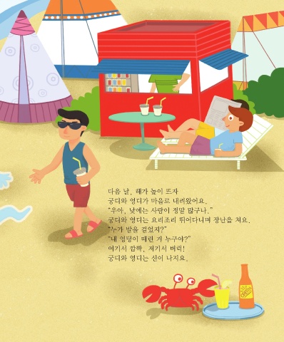 다음 날, 해가 높이 뜨자 궁디와 엉디가 마을로 내려왔어요. “우아, 낮에는 사람이 정말 많구나.” 궁디와 엉디는 요리조리 뛰어다니며 장난을 쳐요. “누가 발을 걸었지?” “내 엉덩이 때린 거 누구야?” 여기서 깜짝, 저기서 버럭! 궁디와 엉디는 신이 나지요.