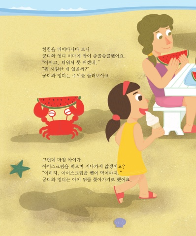 한참을 뛰어다니다 보니 궁디와 엉디 이마에 땀이 송골송골했어요. “아이고, 더워서 못 뛰겠네.” “뭐 시원한 게 없을까?” 궁디와 엉디는 주위를 둘러보아요. 그런데 마침 아이가 아이스크림을 먹으며 지나가지 않겠어요? “이히히, 아이스크림을 뺏어 먹어야지.” 궁디와 엉디는 아이 뒤를 쫓아가기로 했어요.