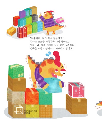 “죄송해요. 제가 다시 쌓을게요.” 친타는 소포를 차곡차곡 다시 쌓아요. 아래, 위, 옆의 크기가 모두 같은 상자끼리, 길쭉한 모양의 상자끼리 따로따로 쌓아요. 정육면체 모양 상자 정육면체