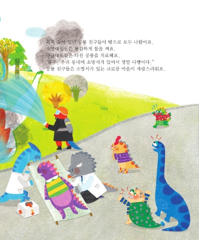 꼭꼭 숨어 있던 공룡 친구들이 밖으로 모두 나왔어요. 소방대원들은 용감하게 불을 꺼요. 구급대원들은 다친 공룡을 치료해요. “휴우, 우리 동네에 소방서가 있어서 정말 다행이다.” 공룡 친구들은 소방서가 있는 크르릉 마을이 자랑스러워요.