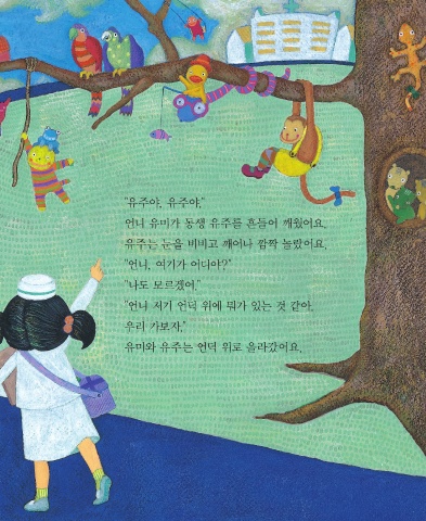 "유주야, 유주야." 언니 유미가 동생 유주를 흔들어 깨웠어요. 유주는 눈을 비비고 깨어나 깜짝 놀랐어요. "언니, 여기가 어디야?" "나도 모르겠어." "언니 저기 언덕 위에 뭐가 있는 것 같아. 우리 가보자." 유미와 유주는 언덕 위로 올라갔어요.