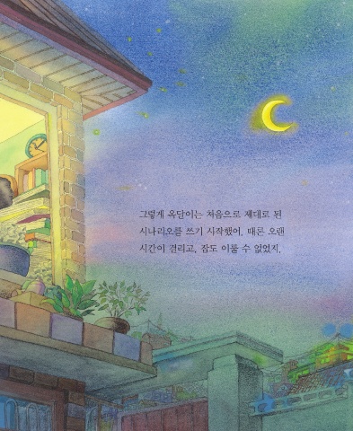 그렇게 옥달이는 처음으로 제대로 된 시나리오를 쓰기 시작했어. 때론 오랜 시간이 걸리고, 잠도 이룰 수 없었지.