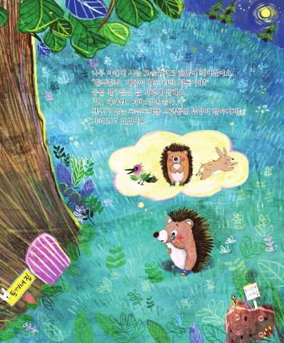 나무 아래에 사는 고슴도치도 한밤에 깨어났어요. “훌쩍훌쩍, 새봄이 와도 나만 외톨이야!” 동물 친구들은 늘 이렇게 말해요. “앗, 따가워. 너하고 안 놀아.” 친구가 없는 고슴도치를 오랫동안 부엉이 할아버지는 지켜보고 있었어요.