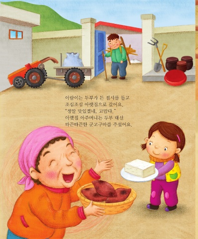 아람이는 두부가 든 접시를 들고 조심조심 아랫집으로 갔어요. “정말 맛있겠네, 고맙다.” 아랫집 아주머니는 두부 대신 따끈따끈한 군고구마를 주셨어요.