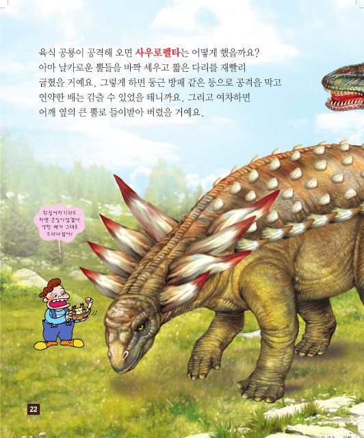 육식 공룡이 공격해 오면 사우로펠타는 어떻게 했을까요? 아마 날카로운 뿔들을 바짝 세우고 짧은 다리를 재빨리 굽혔을 거예요. 그렇게 하면 둥근 방패 같은 등으로 공격을 막고 연약한 배는 감출 수 있었을 테니까요. 그리고 여차하면 어깨 옆의 큰 뿔로 들이받아 버렸을 거예요. 뒤집어지기라도 하면 큰일이었겠어. 약한 배가 그대로 드러나잖아! 22 22 KG2_��_7�.indd 22 11. 12. 9. �� 12:45