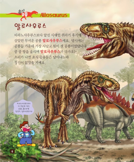 육 식 공룡 Allosaurus 알로사우루스 티라노사우루스보다 앞선 시대인 쥐라기 후기에 살았던 무서운 공룡 알로사우루스예요. 당시에는 공룡들 가운데 가장 사납고 힘이 센 공룡이었답니다. 쿵 쿵 땅을 울리며 알로사우루스가 다가오는 소리가 나면 초식 공룡들은 달아나느라 정신이 없었을 거예요. 티라노사우루스보다 더 무섭게 생긴 공룡을 뽑으라면 당연히 알로사우루스야! 6 6 KG2_��_03�.indd 6 11. 12. 9. �� 12:12