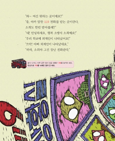 "와~ 여긴 뭐하는 곳이에요?" "응, 아까 말한 119 전화를 받는 곳이란다. 소희도 한번 받아볼래?" "네! 안녕하세요, 행복 소방서 소희예요!" "우리 학교에 외계인이 나타났어요!" "으악! 아빠 외계인이 나타났대요." "하하, 소희야 그건 장난 전화란다." 불이 나거나, 아주 급한 일이 있을 때에만 119를 눌러야 해요. 장난으로 119를 누르면 절대 안 돼요.