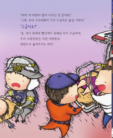 "어머! 저 아줌마 많이 다치신 것 같아요!" "그래, 우리 구조대원이 가서 구급차로 옮길 거란다." "구급차요? " "응, 저기 흰색과 빨간색이 칠해진 차가 구급차야. 우리 소방관들은 다친 사람들을 병원으로 옮겨주기도 하지."