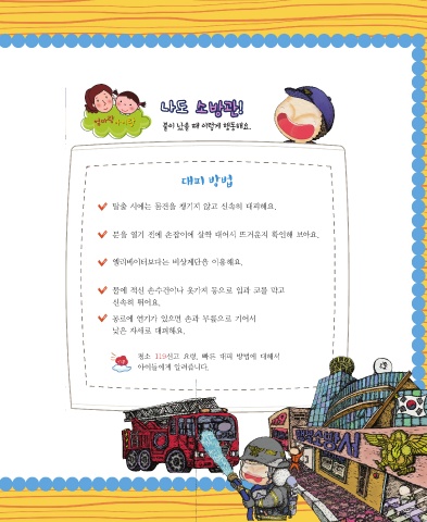 나도 소방관 ! 나도 소방관! 불이 났을 때 이렇게 행동해요. 대피 방법 탈출 시에는 물건을 챙기지 않고 신속히 대피해요. 문을 열기 전에 손잡이에 살짝 대어서 뜨거운지 확인해 보아요. 엘리베이터보다는 비상계단을 이용해요. 물에 적신 손수건이나 옷가지 등으로 입과 코를 막고 신속히 뛰어요. 통로에 연기가 있으면 손과 무릎으로 기어서 낮은 자세로 대피해요. 평소 119신고 요령, 빠른 대피 방법에 대해서 TIP 아이들에게 알려줍니다.