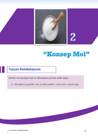 3. 4. Konsep Mol Setelah mempelajari bab ini diharapkan peserta didik dapat : Menghitung jumlah mol, jumlah partikel, massa dan volume gas. E-MODUL STOIKIOMETRI 18