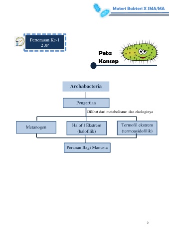 Materi Bakteri X SMA/MA Pertemuan Ke-1 2 JP Peta Konsep Archabacteria Pengertian Dilihat dari metabolisme dan ekologinya Metanogen Halofil Ekstrem Termofil ekstrem (halofilik) (termoasidofilik) Peranan Bagi Manusia 2