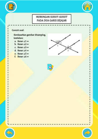 HUBUNGAN SUDUT-SUDUT PADA DUA GARIS SEJAJAR Contoh soal: Berdasarkan gambar disamping, tentukan: a. Besar ∠1 = b. Besar ∠2 = c. Besar ∠3 = d. Besar ∠4 = e. Besar ∠5 = f. Besar ∠6 =