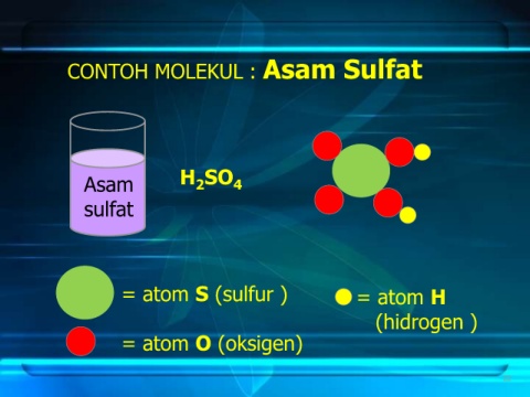 CONTOH MOLEKUL : Asam Sulfat Asam H SO 4 2 sulfat = atom S (sulfur ) = atom H (hidrogen ) = atom O (oksigen) 22