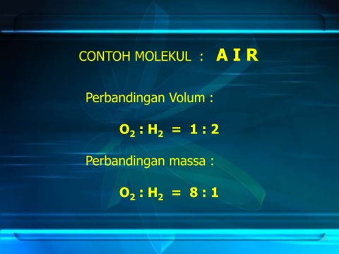 CONTOH MOLEKUL : A I R Perbandingan Volum : O : H 2 = 1 : 2 2 Perbandingan massa : O : H 2 = 8 : 1 2 26
