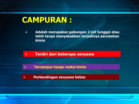 CAMPURAN : Adalah merupakan gabungan 2 zat tunggal atau lebih tanpa menyebabkan terjadinya perubahan kimia Terdiri dari beberapa senyawa Tercampur tanpa reaksi kimia Perbandingan senyawa bebas 28