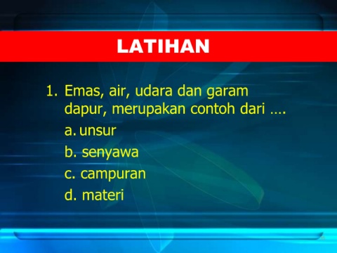 LATIHAN 1. Emas, air, udara dan garam dapur, merupakan contoh dari …. a. unsur b. senyawa c. campuran d. materi 35