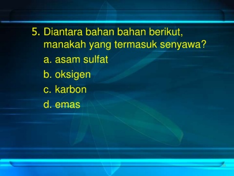 5. Diantara bahan bahan berikut, manakah yang termasuk senyawa? a. asam sulfat b. oksigen c. karbon d. emas 39