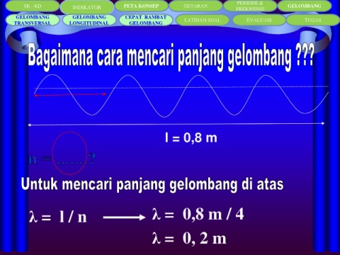 PERIODE & SK - KD INDIKATOR PETA KONSEP GETARAN FREKWENSI GELOMBANG GELOMBANG GELOMBANG CEPAT RAMBAT TRANSVERSAL LONGITUDINAL GELOMBANG LATIHAN SOAL EVALUASI TUGAS l = 0,8 m λ = l / n λ = 0,8 m / 4 λ = 0, 2 m