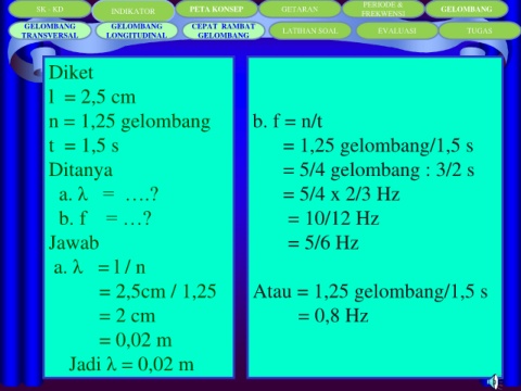 = 2,5cm / 1,25 Atau = 1,25 gelombang/1,5 s