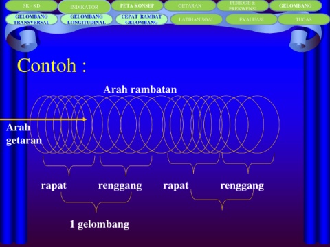 PERIODE & SK - KD INDIKATOR PETA KONSEP GETARAN FREKWENSI GELOMBANG GELOMBANG GELOMBANG CEPAT RAMBAT TRANSVERSAL LONGITUDINAL GELOMBANG LATIHAN SOAL EVALUASI TUGAS Contoh : Arah rambatan Arah getaran rapat renggang rapat renggang 1 gelombang