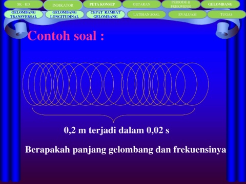 PERIODE & SK - KD INDIKATOR PETA KONSEP GETARAN FREKWENSI GELOMBANG GELOMBANG GELOMBANG CEPAT RAMBAT TRANSVERSAL LONGITUDINAL GELOMBANG LATIHAN SOAL EVALUASI TUGAS Contoh soal : 0,2 m terjadi dalam 0,02 s Berapakah panjang gelombang dan frekuensinya