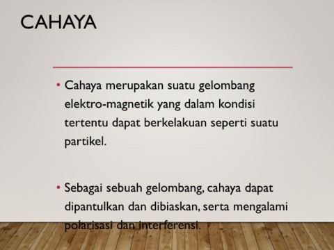 CAHAYA • Cahaya merupakan suatu gelombang elektro-magnetik yang dalam kondisi tertentu dapat berkelakuan seperti suatu partikel. • Sebagai sebuah gelombang, cahaya dapat dipantulkan dan dibiaskan, serta mengalami polarisasi dan interferensi.