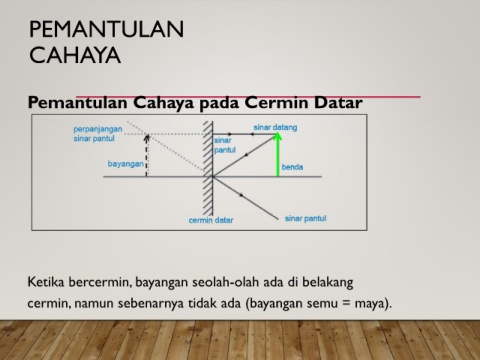 PEMANTULAN CAHAYA Pemantulan Cahaya pada Cermin Datar Ketika bercermin, bayangan seolah-olah ada di belakang cermin, namun sebenarnya tidak ada (bayangan semu = maya).