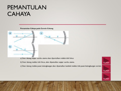 b) Sinar datang melalui titik fokus, akan dipantulkan sejajar sumbu utama. FLASH