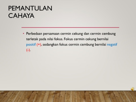 PEMANTULAN CAHAYA • Perbedaan persamaan cermin cekung dan cermin cembung terletak pada nilai fokus. Fokus cermin cekung bernilai positif (+), sedangkan fokus cermin cembung bernilai negatif (-).