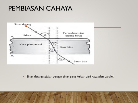 PEMBIASAN CAHAYA • Sinar datang sejajar dengan sinar yang keluar dari kaca plan paralel.
