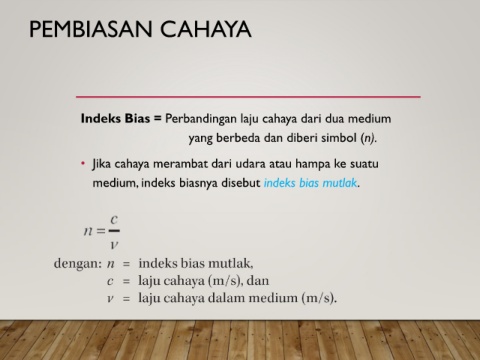 PEMBIASAN CAHAYA Indeks Bias = Perbandingan laju cahaya dari dua medium yang berbeda dan diberi simbol (n). • Jika cahaya merambat dari udara atau hampa ke suatu medium, indeks biasnya disebut indeks bias mutlak.