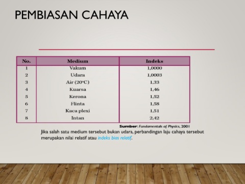 PEMBIASAN CAHAYA Tabel Indeks Bias dari Beberapa Medium Jika salah satu medium tersebut bukan udara, perbandingan laju cahaya tersebut merupakan nilai relatif atau indeks bias relatif.