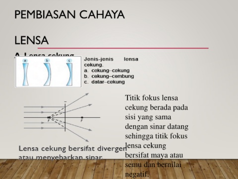 PEMBIASAN CAHAYA LENSA A. Lensa cekung Titik fokus lensa cekung berada pada sisi yang sama dengan sinar datang sehingga titik fokus lensa cekung bersifat maya atau semu dan bernilai negatif.