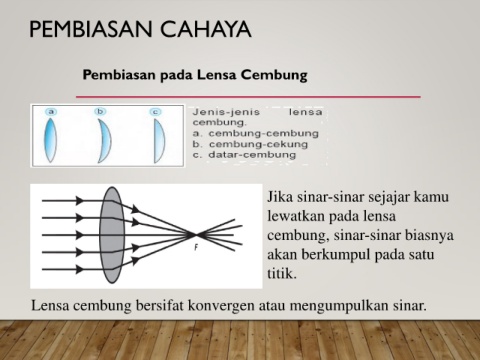 PEMBIASAN CAHAYA Pembiasan pada Lensa Cembung Jika sinar-sinar sejajar kamu lewatkan pada lensa cembung, sinar-sinar biasnya akan berkumpul pada satu titik. Lensa cembung bersifat konvergen atau mengumpulkan sinar.