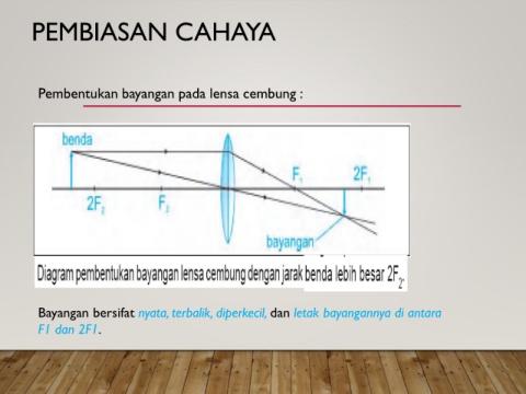 PEMBIASAN CAHAYA Pembentukan bayangan pada lensa cembung : Bayangan bersifat nyata, terbalik, diperkecil, dan letak bayangannya di antara F1 dan 2F1.