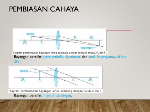 PEMBIASAN CAHAYA Bayangan bersifat nyata, terbalik, diperbesar, dan letak bayangannya di luar 2F1. Bayangan bersifat maya di tak hingga.