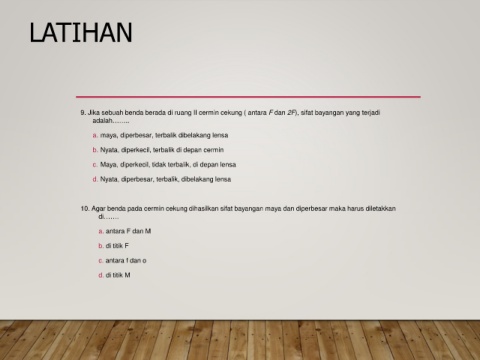 10. Agar benda pada cermin cekung dihasilkan sifat bayangan maya dan diperbesar maka harus diletakkan