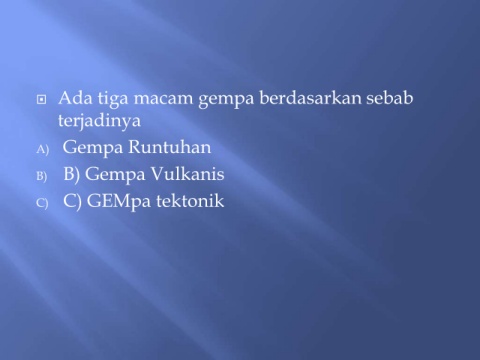 Ada tiga macam gempa berdasarkan sebab terjadinya A) Gempa Runtuhan B) B) Gempa Vulkanis C) C) GEMpa tektonik