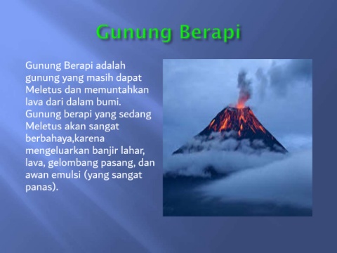 Gunung Berapi adalah gunung yang masih dapat Meletus dan memuntahkan lava dari dalam bumi. Gunung berapi yang sedang Meletus akan sangat berbahaya,karena mengeluarkan banjir lahar, lava, gelombang pasang, dan awan emulsi (yang sangat panas).